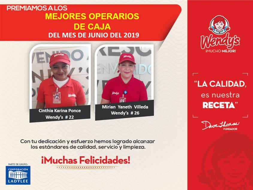 Felicitamos a nuestros mejores operarios de caja de Wendy’s Honduras en el mes de junio. ¡SomosCLL!