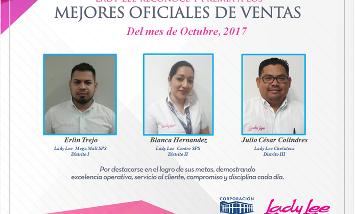 Lady Lee Honduras Premia a los Mejores Oficiales de Ventas del Mes de Octubre 17 de noviembre de 2017 Abdiel Licona No Comments 270 Views Compartir en Lady Lee Honduras Premia a los Mejores Oficiales de Ventas del Mes de Octubre