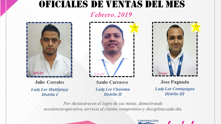 Mejores oficiales de ventas-Lady Lee 15 de marzo de 2019 Abdiel Licona No Comment 346 Views Compartir en Felicitamos a nuestros oficiales de ventas de Lady Lee Honduras en el mes de febrero.