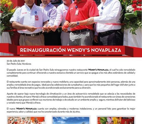 Reinauguración Wendy’s Novaplaza ¡Mucho Mejor! Wendy’s Honduras 1 de agosto de 2017 Abdiel Licona No Comments 416 Views Compartir en Reinauguración Wendy’s Novaplaza ¡Mucho Mejor! Wendy’s Honduras