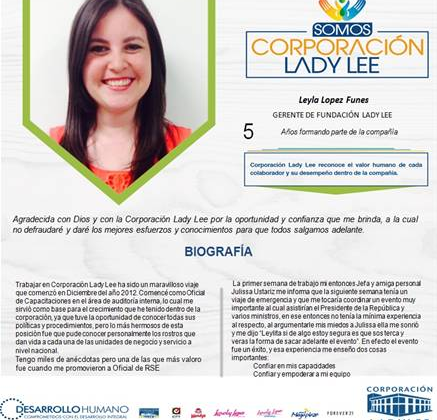Somos corporación 23 de mayo de 2017 Abdiel Licona No Comments 410 Views Compartir en ¡Somos Corporación Lady Lee! Leyla Lopez, Gerente de Fundación Lady Lee